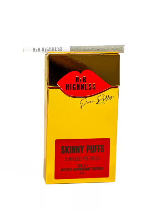 Skinny Puffs are designed for the woman who wants a chic, functional high with appetite control built in. Infused with both THC and THCV, these slim, elegant pre-rolls deliver an uplifting buzz with enhanced focus, energy, and appetite suppression. Perfect for social settings, workdays, or anytime you want to stay high without the munchies, Skinny Puffs are the ultimate lifestyle pre-roll. Each five-pack features Her Highness’ signature feminine cones with elongated crutches, ready to elevate your smoke and diminish cravings.