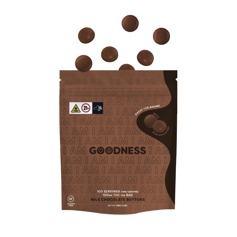 Milk Chocolate Buttons 100MG THC per bag (1mg/serving) Microdose with our I Am Goodness chocolate buttons. These micro buttons in milk chocolate are perfect for creating your own dosing, tailored to your recreational tolerance and therapeutic needs.