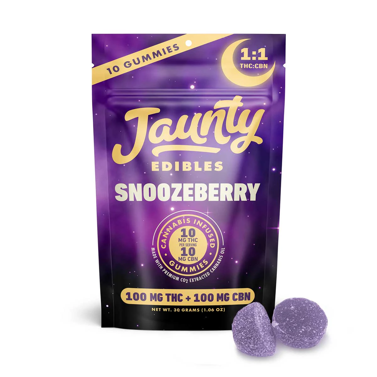 Need a little rest and relaxation? Wind|down your day with Jaunty’s Snoozeberry|gummies! Each piece comes formulated|with 10mg THC and 10mg CBN for the|perfect nighttime treat. Sweet dreams...