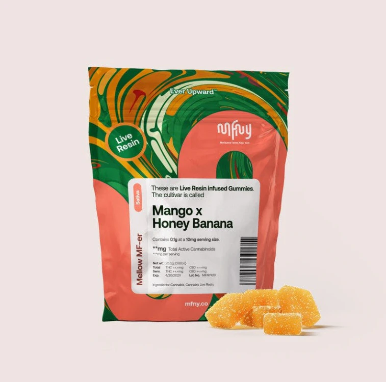 Terpene-rich edibles at an even tastier price. Introducing our live resin Mango x Honey Banana gummies. These vegan gummies are infused with MFNY’s single-source, in-house produced Honey Banana live resin. We start with fresh-frozen flower buds, then use the hydrocarbon extraction method (plus years of experience and scientific precision) to deliver the purest plant extract. An extract that showcases the cultivar's naturally-produced, full-spectrum cannabinoids and remarkable natural terpenes. Honey Banana is known for its flavors of strawberry, banana, and sweet honey. To complement the Honey Banana cultivar, we add the minimum amount of sugar, plus mango flavors.