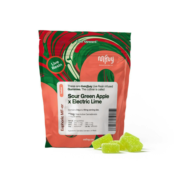 MFNY Live Resin Gummies Sour Green Apple x Electric Lime Sativa 10pk deliver a zesty, energizing experience packed with bold, tangy flavor. Infused with full-spectrum live resin from Sour Green Apple x Electric Lime, these gummies burst with crisp, sour-sweet notes and a refreshing citrus kick. Each piece offers uplifting, creative, and mood-boosting sativa effects—perfect for daytime adventures, social settings, or sparking motivation. Crafted with strain-specific live resin to preserve natural terpenes and flavor, MFNY Live Resin Gummies Sour Green Apple x Electric Lime Sativa provide a clean, flavorful, and consistently potent edible experience in every 10-pack.