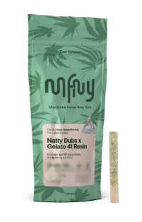 For our resin infused pre-rolls, we start with premium, hand-trimmed whole Natty Dubbz flower then infuse it with our in-house made Gelato 41 live resin HTFSE (High Terpene Full Spectrum Extract from fresh frozen buds). This process creates a higher potency, flavorful product with the best of two cultivars: the earthy and gasoline flavors of the Natty Dubbz cultivar, balanced with the earthy and pine aromas and sweet sherbet flavors of the legendary Gelato 41 cultivar.