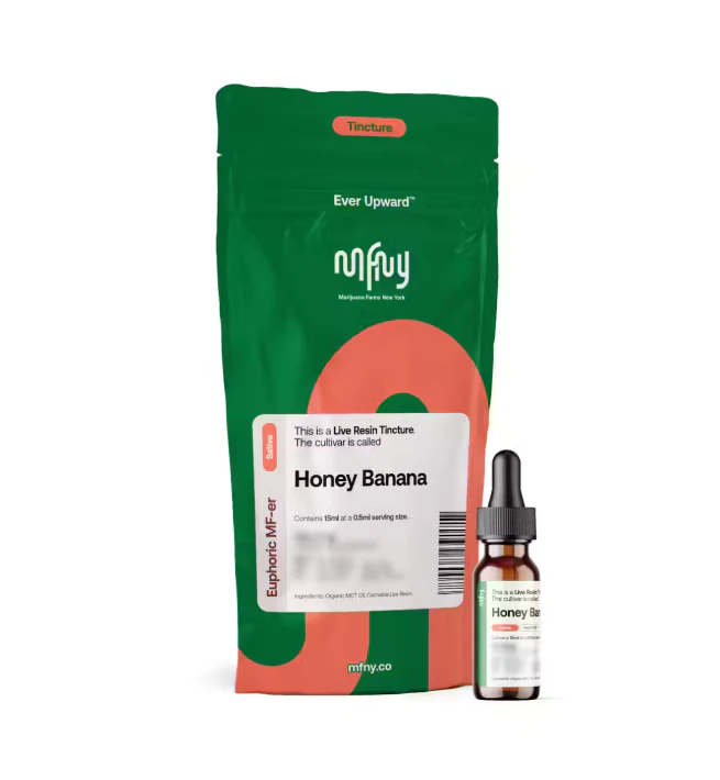 Honey Banana is a sweet and fruity hybrid with a story as unique as its flavor. A very popular variety amongst solventless hash producers, MFNY believes this terpene profile is best expressed through solvent extraction; this cultivar is made possible by crossing Strawberry Banana and Honey Boo Boo. This cultivar was a hidden gem for the longest time—earning a reputation for standout traits, including its exceptional wash yield in solventless extraction. The flavor profile of Honey Banana is true to its name, but with a twist. Unlike older cultivars that have an overripe banana flavor, this cultivar offers the fresh sweetness of green bananas, balanced by notes of rich honey. A bright and unique flavor experience, this is a cultivar often found at the top of many dab enthusiasts’ lists. Known for its sprawling, sativa-like growth pattern, Honey Banana can be challenging to cultivate, requiring ample space to thrive. When properly grown, its dense, frosty buds and light blonde trichomes help deliver a strong, euphoric head high. With its uplifting effects and rare, sweet green banana profile, this cultivar is a fan favorite known for leaving a pleasant lasting impression in people’s mouths and minds. With activated THC entering the bloodstream at a more rapid rate, people may experience relief from anxiety, pain, and nausea; others say it can create an appetite or aid with sleep. The dropper means that whether you’re a beginner or enthusiast, you can choose a lighter or heavier dose that’s just right (your “Goldilocks Zone”).
