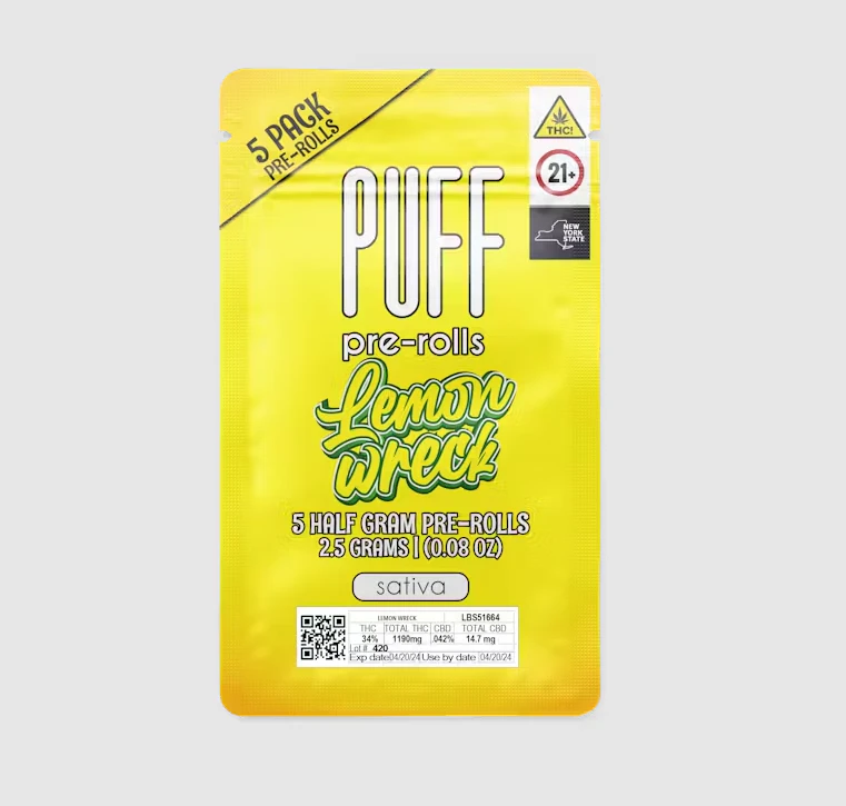 The Puff Lemon Wreck pre-roll is the perfect choice for those looking for a fresh and uplifting experience. This premium sativa flower boasts a tangy lemon aroma, with hints of diesel and pine, that invigorates the senses and enhances mood. The uplifting effects of Lemon Wreck are perfect for starting the day or enjoying a night out with friends. Enjoy the bold, citrusy flavor of Lemon Wreck in a convenient, ready-to-use pre-roll that is perfect for on-the-go enjoyment.