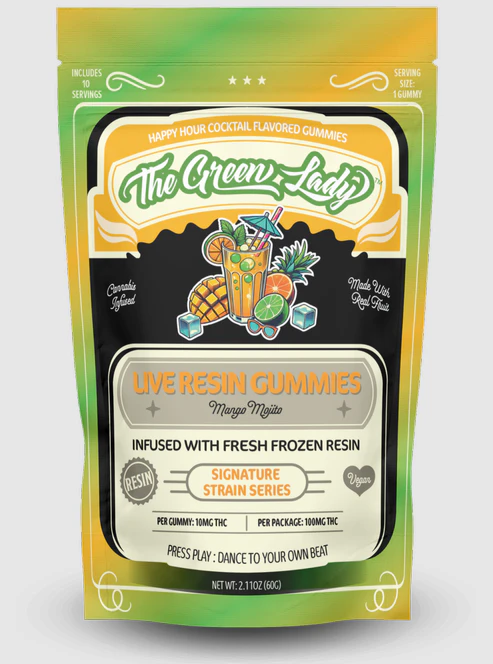 Ready to kick off your next adventure? Our Mango Mojito gummies are made with live resin and crafted to elevate your mood with every juicy, citrus-kissed bite. Infused with mango purée, lime essence, and finished with a puckering sour sugar coating, they deliver bold flavor and bright effects. Whether you're headed to a summer party or dancing in your living room, Mango Mojito is your go-to for feel-good fun. Mango Mojito blends the tropical richness of real mango with zesty lime and a tangy sour sugar finish. It’s a fruity, citrusy combo that starts with a tangy punch and mellows into sweet, tropical bliss.